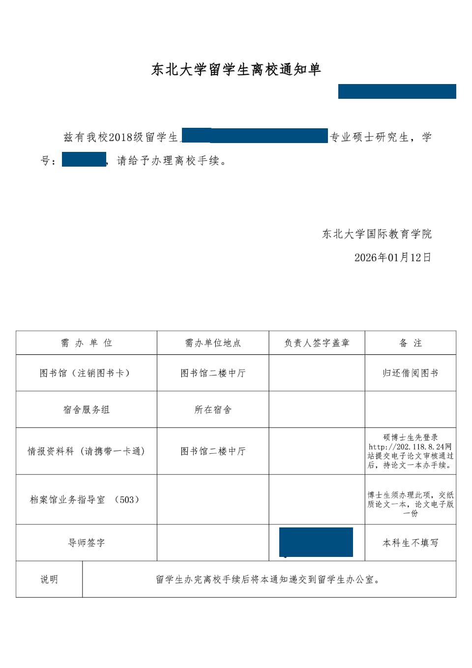 东北大学留学生离校通知单(留学生离校按离校通知相关要求交接完成后,领取毕业证和学位证)